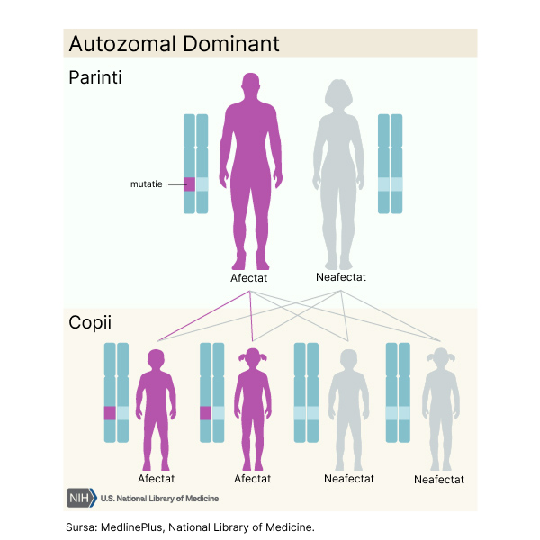 Alte cazuri sunt cauzate de mutatii noi (de novo) care apar in timpul formarii celulelor reprodutoare (ouale sau spermatozoizii) sau in dezvoltarea timpurie a embrionului. Aceste cazuri apar la persoane fara istoric de afectiune in familie [2].